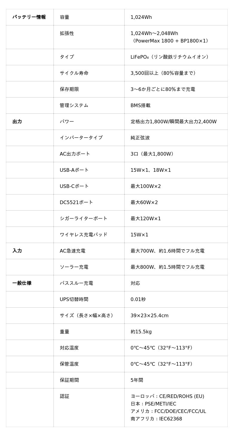 - 1800Wの大出力で家電からアウトドアまで安心定格1800W・瞬間最大2400Wのパワーを備え、ドライヤーや電気オーブンなど家庭用の約99%の家電に対応。停電時にも冷蔵庫や炊飯器を動かせるほか、キャンプや車中泊でも快適に過ごせます。