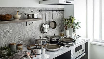 CORELLEフライパンは、独自技術のデュラナノテクノロジーによって、こびりつきやすさを解消したフライパンで、外側にステンレス鋼、中間層にアルミニウム、内面に超高温レーザーでチタン・ジルコニウム・セラミック粉末を融合加工したステンレスの3層構造を採用する。