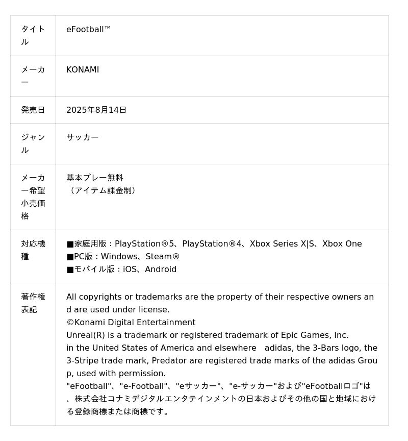 『eFootball(TM)』は、1995年7月21日に第1作を発売した、人気サッカーゲーム「ウイニングイレブン」シリーズをリブランディングしたタイトルです。世界累計ダウンロード数は9億を超え、世界中のサッカーファンの皆様に愛され、今年で30周年を迎えました。家庭用ゲーム機、PC、モバイルで“基本プレー無料”で遊ぶことができ、実在するクラブや代表チームでリアルなアクションサッカーを楽しめます。また、選手の移籍や試合での活躍など、現実のサッカーの動向も毎週反映されます。