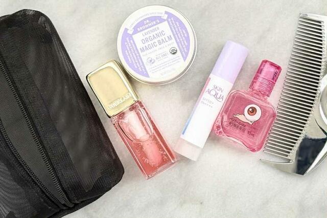 ポーチに入れているのは、 目薬とスティック式日焼け止め、万能バームと櫛だけ。サコッシュなど、小さなカバンにも入るミニマムポーチの完成に心が踊ります。