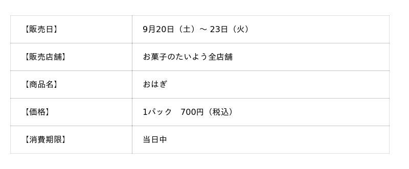 株式会社太陽社(所在地:千葉県匝瑳市飯倉293、代表取締役:片岡正裕)が展開する、千葉県で長年愛され続ける菓子店「お菓子のたいよう」では、毎年大好評をいただいている伝統の和菓子「おはぎ」を、9月20日(土)~9月23日(火)の彼岸入りから中日までの4日間限定で発売いたします。