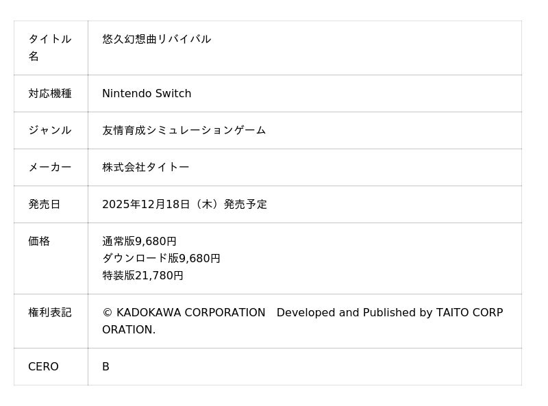 株式会社タイトー(本社:東京都新宿区、以下タイトー)は、12月18日(木)発売予定のNintendo Switch(TM)用ソフト『悠久幻想曲リバイバル』について、リメイクされたゲーム画面も確認できるPV第2弾を、本日新たに公開いたします。