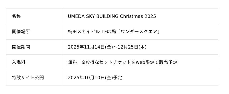 2025年11月14日(金)~12月25日(木)の42日間、梅田スカイビル1F広場「ワンダースクエア」で『UMEDA SKY BUILDING Christmas 2025』を開催いたします。