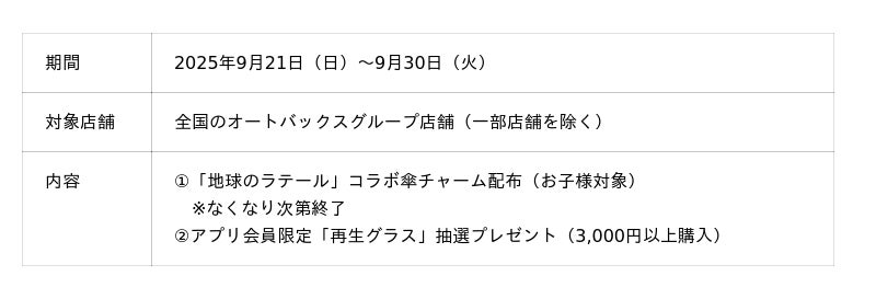さらに、オートバックスアプリ会員限定で、期間中に3,000円以上ご購入いただいたお客様の中から抽選で500名様に車のリサイクルガラスを使用した、伝統工芸品・江戸硝子の「再生グラス」をプレゼントいたします。