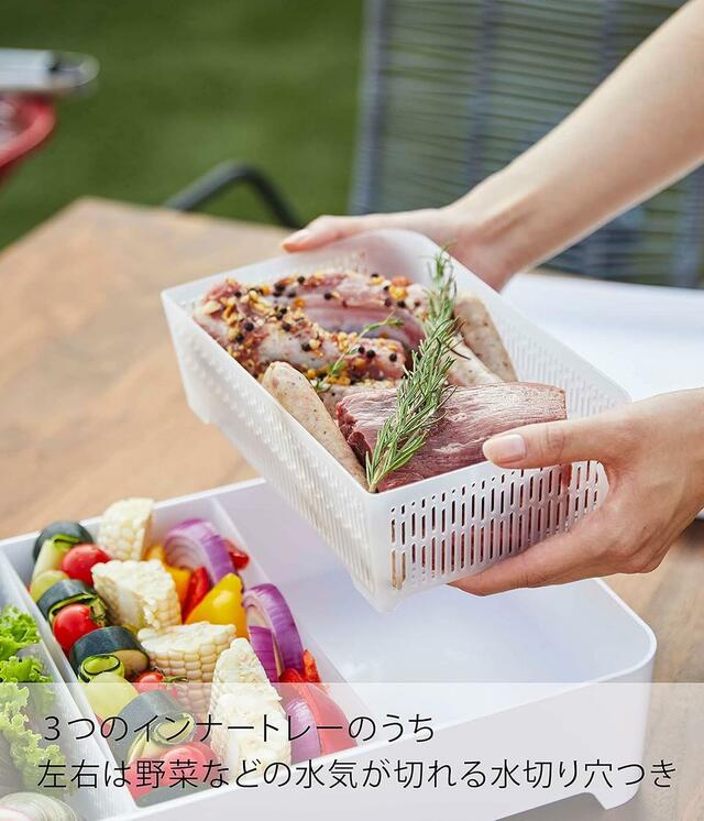 3つのインナートレー付きで食材の整理がしやすく、蓋を閉めてそのまま冷蔵庫へ。アウトドアでも活躍する万能アイテムです。