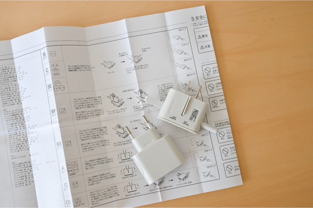 2つの変換プラグは組み合わせ方によって全世界のプラグに対応していて、説明書に分かりやすく記載されているので、どんな国でもホテルに着いてすぐスムーズに使うことができます。