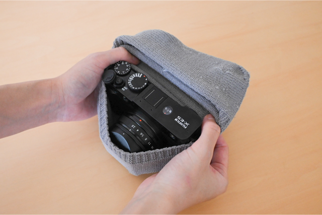 また、ニット素材が緩衝材代わりにもなってくれるので、カメラやレンズの持ち運びも安心感があります。