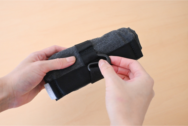 膨らませたあとは、吹き込み口をくるっと丸めてフックで留めるだけでしっかり空気をホールドできます。
