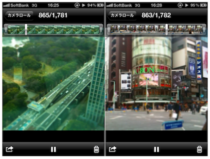 ただのムービーじゃありません。撮影すするだけでミニチュア早回し映像ができあがります。高いビルの上から高速道路を撮影したり、銀座や渋谷など人の多い交差点で定点観測したりすると、誰でもいい絵が撮れます。