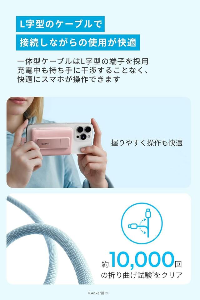 L字型に設計された一体型USB-Cケーブルにも注目。スマホと接続したままでもケーブルが手に干渉せず、ゲームやSNS中もストレスなく使用できます。デザイン性と実用性のバランスが取れた、ちょうどいい本商品、日常使いにも旅行にもぴったりですよ。