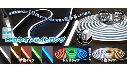 ジェイダブルシステムは8月25日に、片側電源のみで最長10mの点灯が可能なLEDテープを、シリコンチューブで密封した「LEDネオンライトロング」を発売した。長さは10m、ラインアップは単色、RGB、2色の3種類で、いずれも価格は6万8640円。