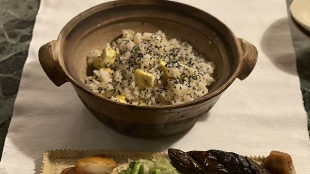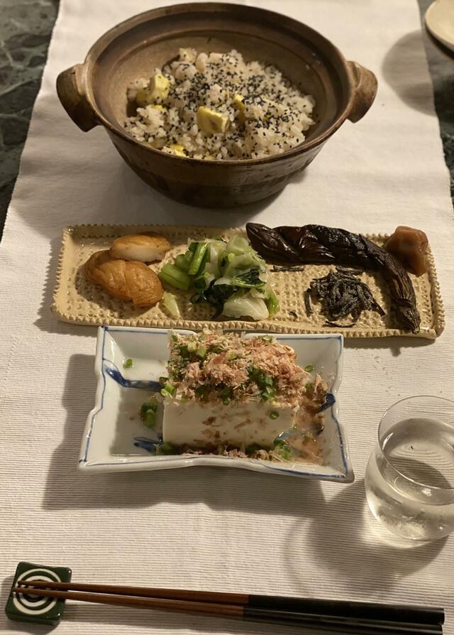 栗ごはん、美味しいだろうなあと思って買った栗だったが、新鮮じゃなく、しかも虫食いも多い。鬼皮も渋皮も剥くのが大変。苦労の末に出来上がった栗ごはん、これが美味しかったので、超嬉しかった。苦労した甲斐があったわい。さつま揚げ、野沢菜の漬物、焼きなす、冷や奴(ネギや生姜、削り節など)。