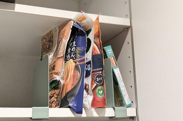 我が家ではふりかけなどの袋に入った食料品や調味料が結構嵩張っていたのですが、ふと思い立ってこのブックエンドを導入してみたところサイズも固定感もぴったり……!