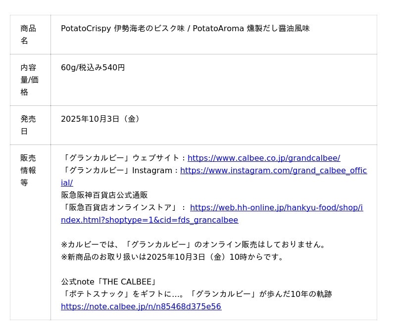 カルビー株式会社(本社:東京都千代田区、代表取締役社長兼CEO:江原 信)は、阪急うめだ本店(大阪府大阪市)で展開している“ギフトにしたいポテトスナック”を扱う「グランカルビー」より、新商品として『PotatoCrispy 伊勢海老のビスク味』『PotatoAroma 燻製だし醤油風味』を、2025年10月3日(金)から発売します。