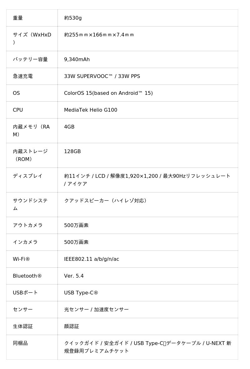 ■OPPO Pad SE製品の仕様・スペック