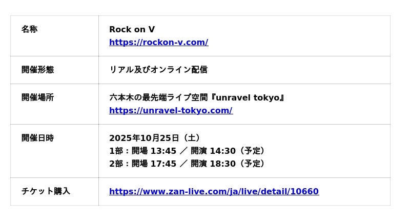 「All for Streamers」のコンセプトで、YouTube・Twitch・Mirrativなどの各配信プラットフォームで活動する配信者(VTuber/ストリーマー等)を支援する株式会社ミラティブ(本社:東京都目黒区 代表取締役:赤川隼一)のグループ会社である、株式会社アイブレイド(本社:東京都板橋区 代表取締役社長:妻木 泰夫)が企画・運営プロデュースをするVTuber × 生バンドの新感覚音楽フェス 『Rock on V』 の第7回公演を、2025年10月25日(土)に東京・六本木のライブハウス「unravel tokyo」にて開催することをお知らせいたします。