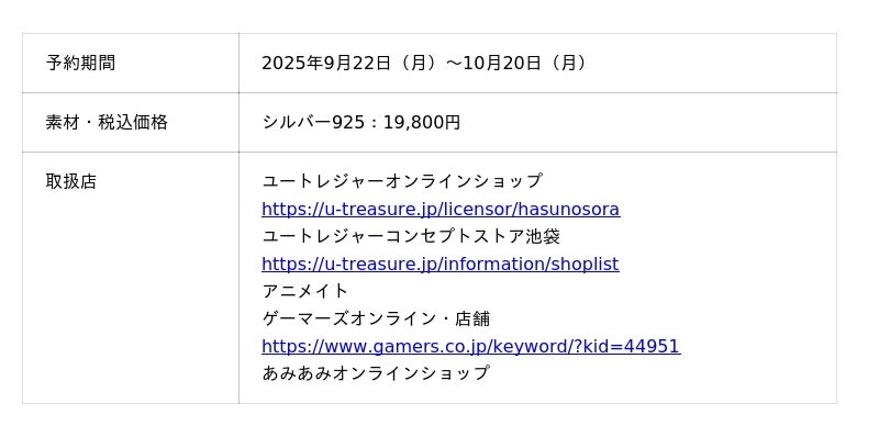 株式会社ユートレジャー(本社:東京都新宿区、代表取締役社長:青木 興一、株式会社ケイ・ウノの連結子会社)は、「ラブライブ!蓮ノ空女学院スクールアイドルクラブ」とのコラボレーションアイテム「ユニットリングネックレス」の予約受付を、2025年9月22日(月)~10月20日(月)の期間、ユートレジャーオンラインショップ、ユートレジャーコンセプトストア池袋にて行います。