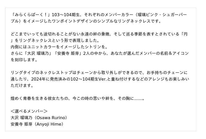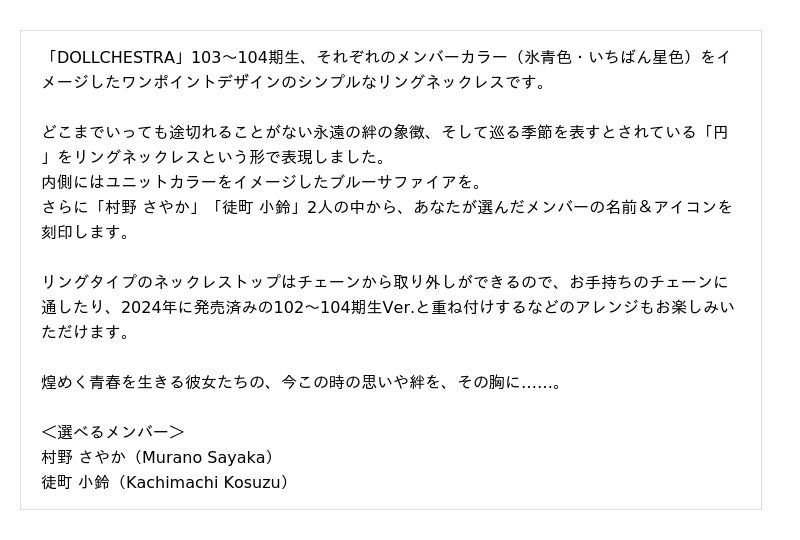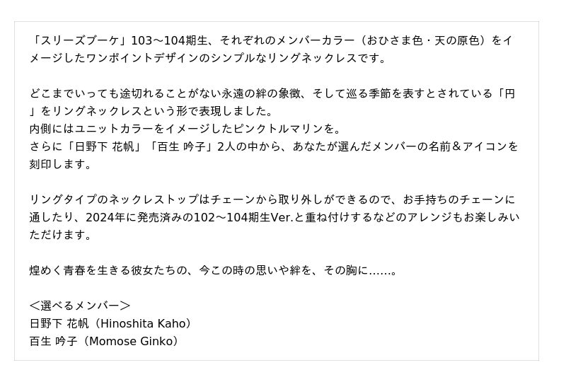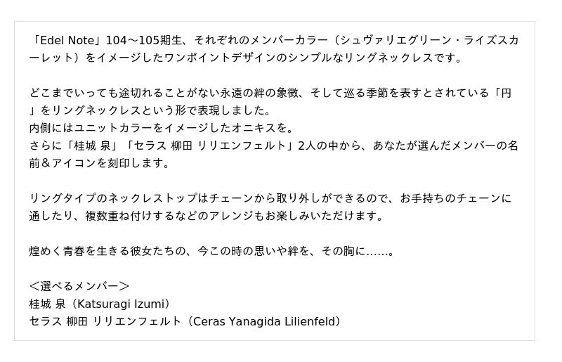 このたびの新作は、ラブライブ!蓮ノ空女学院スクールアイドルクラブの各ユニットのメンバーカラーをあしらったリングネックレスの第二弾です。リングの内側に各ユニットカラーをイメージした天然石を留め、選んだメンバーの名前&アイコンを刻印したデザインです。