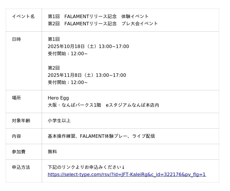株式会社Meta Heroes(本社所在地:大阪府大阪市、代表取締役:松石和俊、以下「当社」)は、ソリッドソニック株式会社(兵庫県神戸市、代表取締役:久保貴弘)、株式会社ASTOLTIA(東京都渋谷区、代表取締役:若林祐衣)、株式会社オンテロープ(東京都新宿区、代表取締役:澤田真吾)と共同で開発したメタバースゲーム『FALAMENT』(ファラメント)の体験イベントを2025年10月18日(土)と11月8日(土)に開催いたします。