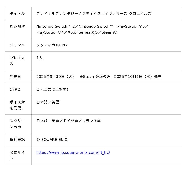 株式会社スクウェア・エニックス(本社:東京都新宿区、代表取締役社長:桐生 隆司)が2025年9月30日(火)に発売を予定しているタクティカルRPG『ファイナルファンタジータクティクス - イヴァリース クロニクルズ』が、9月25日(木)から 28日(日)開催の「東京ゲームショウ2025」に出展します。