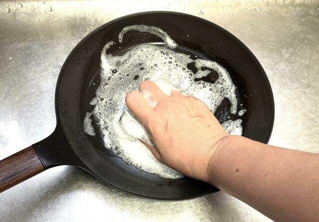 バーミキュラのフライパンは鉄製ですが、前述の独自のホーローコーティングで油膜を育てる必要がないので、食器用洗剤でガシガシ洗えちゃいます。