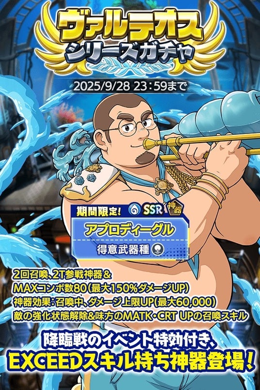 イベント特攻付き、EXCEEDスキル持ちの新シリーズ神器が登場する「ヴァルテオスシリーズガチャ」が開催!今回は「アプロディーグル」が登場します!