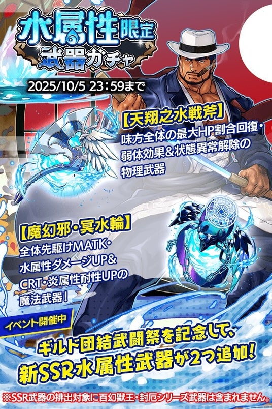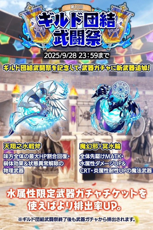 また、武器ガチャに「天翔之水戦斧」「魔幻邪・冥水輪」の2種が追加!イベント報酬の水属性限定武器ガチャチケットでも入手可能ですので、ぜひイベントに挑戦してみてください。