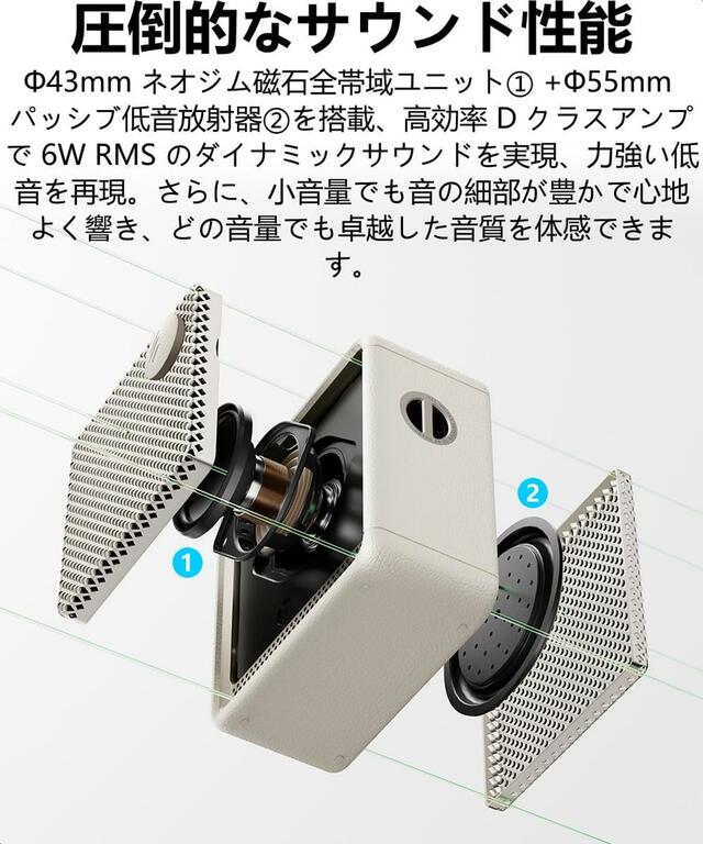 Φ43mmフルレンジユニット+Φ55mmパッシブラジエーターを搭載。6W(RMS)/ピーク出力12Wのダイナミックな低音とクリアな高音を両立し、音楽への没入感を高めます。