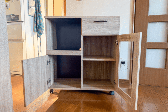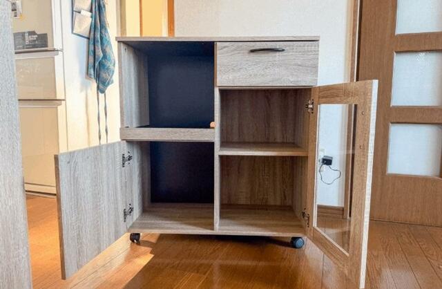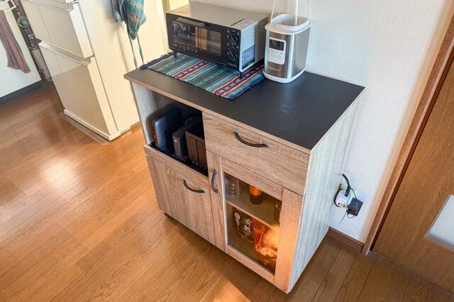 キッチン家電を収納するのはもちろん、我が家のようにごちゃつきやすいルーター類のほか本など、幅広いものの収納に活躍するデザイン。