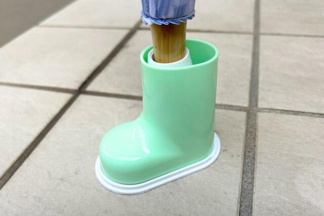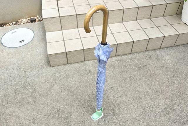 小人の靴みたいなサイズ感がかわいいこのアイテム。長傘に取り付けておくだけで、どこにでも傘を置けるようになります。