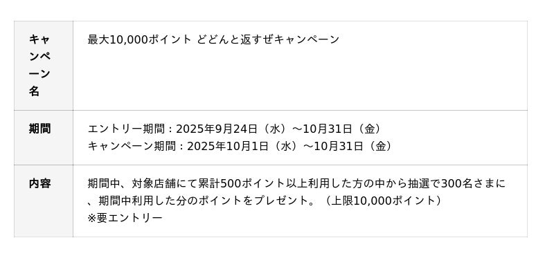 期間中、対象店舗で累計500ポイント以上利用すると抽選で300名さまに利用した分のポイントが戻ってくる!