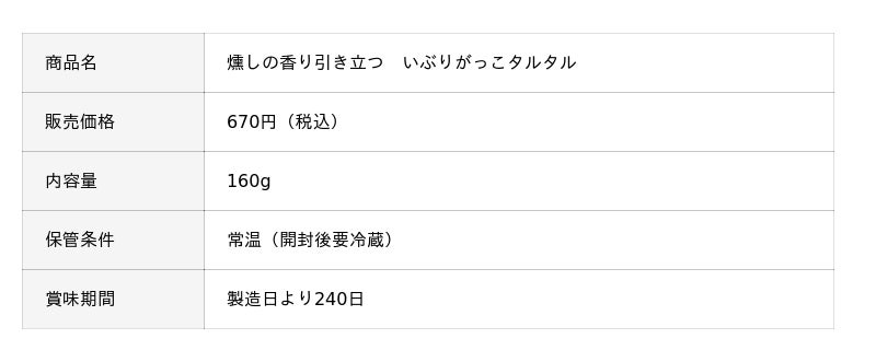 リニューアルにあたっては、従来以上に美味しさを追求するとともに、安全・安心な品質に徹底的にこだわり、どなたにも自信をもっておすすめできる一品を目指しました。株式会社サンクゼールとの協働を通じて生まれた新しい「燻しの香り引き立つ いぶりがっこタルタル」が、皆さまの食卓に笑顔と“うまい!”をお届けできることを心より願っています。