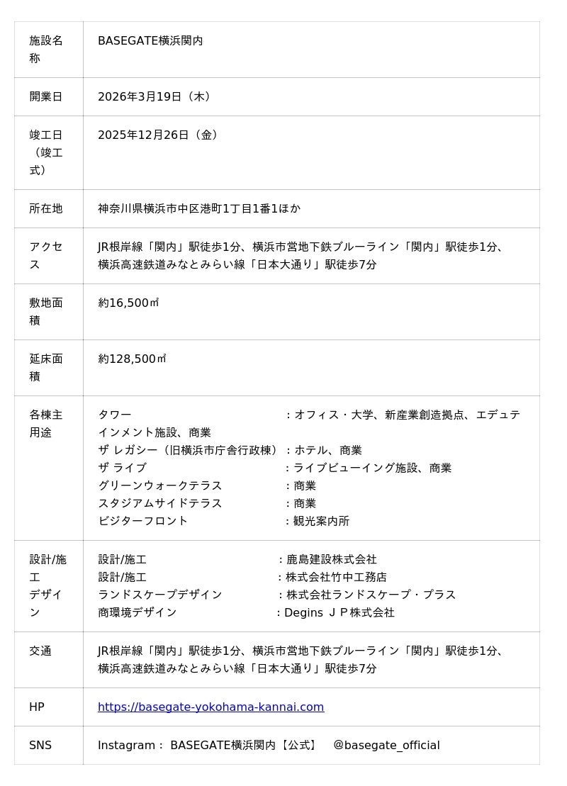 - JR「関内」駅前における大規模ミクストユース型プロジェクト「BASEGATE(ベースゲート)横浜関内」のグランドオープンが2026年3月19日に決定