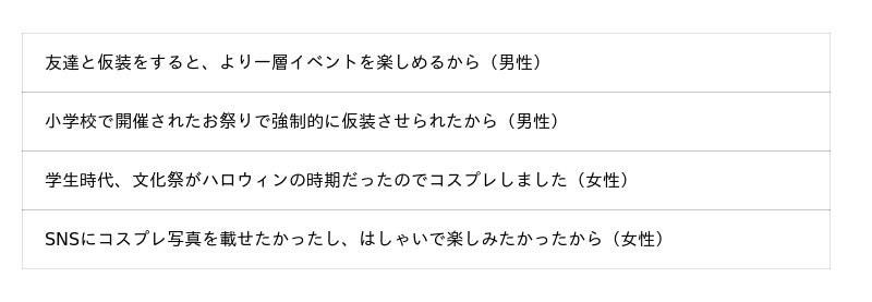 続いて、コスプレをした理由・しなかった理由を聞いたところ、以下のような意見が寄せられました。