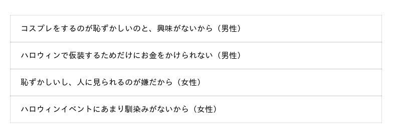 周りに一緒に楽しむ人がいない、そもそもハロウィンを楽しむ習慣がなければ、コスプレをする機会がつくりにくいのかもしれません。