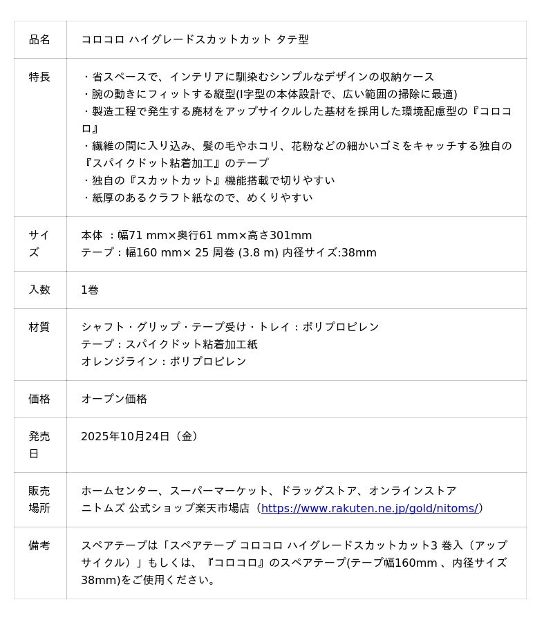 株式会社ニトムズ(本社:東京都品川区、代表取締役社長:右近敦嗣)は、省スペースに収納ができて、使いたい時にすぐ使える、新設計の縦型(I字型)粘着クリーナー『コロコロ ハイグレードスカットカット タテ型』を 2025 年10月24 日(金)に発売します。