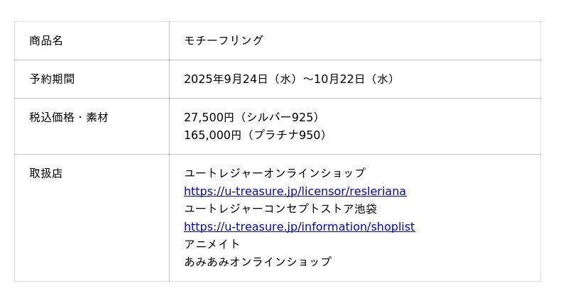 株式会社ユートレジャー(本社:東京都新宿区、代表取締役社長:青木 興一、株式会社ケイ・ウノの連結子会社)は、シネマティック錬金術RPG「レスレリアーナのアトリエ」とのコラボレーションアイテム「モチーフリング(指輪)」の予約受け付けを、9月24日(水)~10月22日(水)の期間、ユートレジャーオンラインショップ、ユートレジャーコンセプトストア池袋にて行います。
