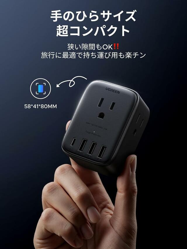 本体サイズは58×41×80mmと手のひらほどのコンパクト設計。旅行カバンやリュックの隅にすっと入れられるので、出張や旅行にも最適です。