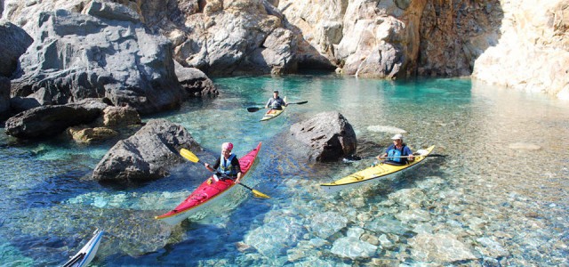 海の上を移動するためのボート、シーカヤック。海あそびや海上散歩の道具として広く親しまれています。波を直接感じることができる乗り物ですね。