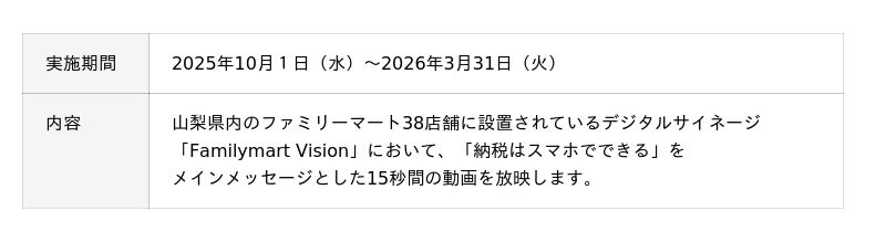 今般、本プロジェクトの一環として、国税および地方税における電子納付のさらなる普及を目的に、「電子納付スターターキャンペーン」を実施するとともに、山梨県内のファミリーマートの店舗において動画放映による情報発信を行います。