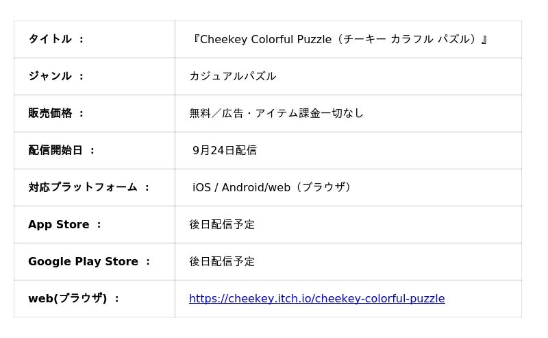 ただのゲームではなく“遊べるアート”を目指した本作、『Cheeky Colorful Puzzle』はweb版を9月24日配信開始!android、iOS版は後日配信予定です。