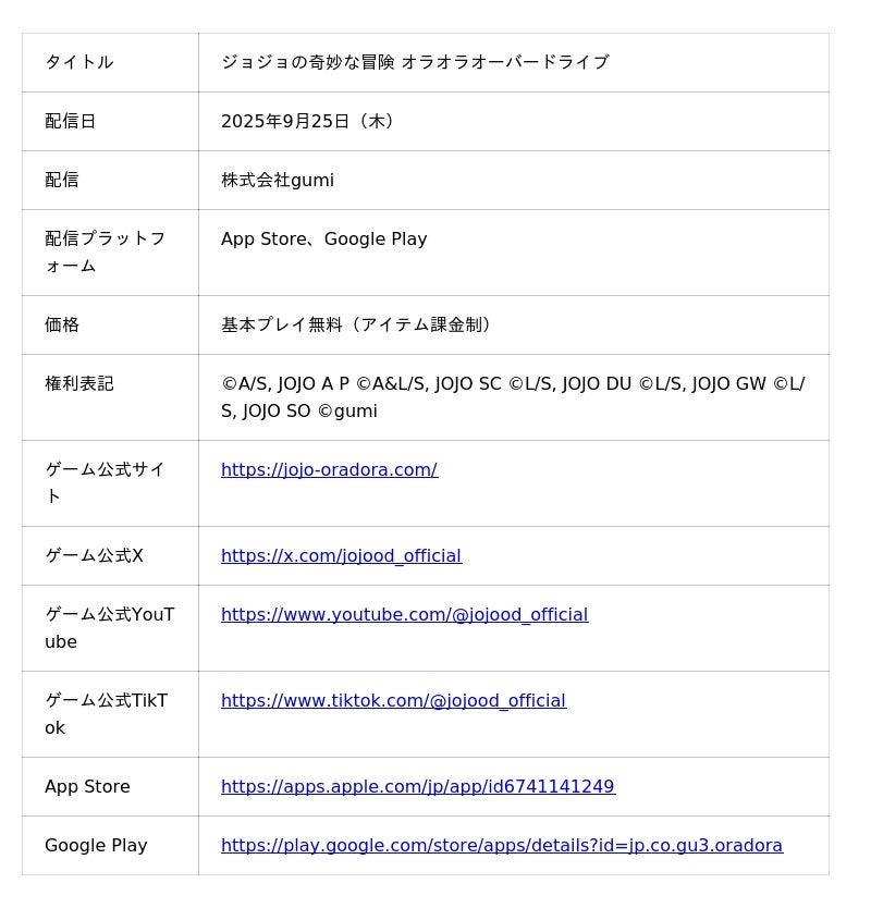 株式会社gumi(本社:東京都新宿区、代表取締役社長:川本 寛之)は、『ジョジョの奇妙な冒険』のアニメーションIPを活用した新作アプリゲーム『ジョジョの奇妙な冒険 オラオラオーバードライブ』の事前登録者数が100万人を突破したことをお知らせいたします。