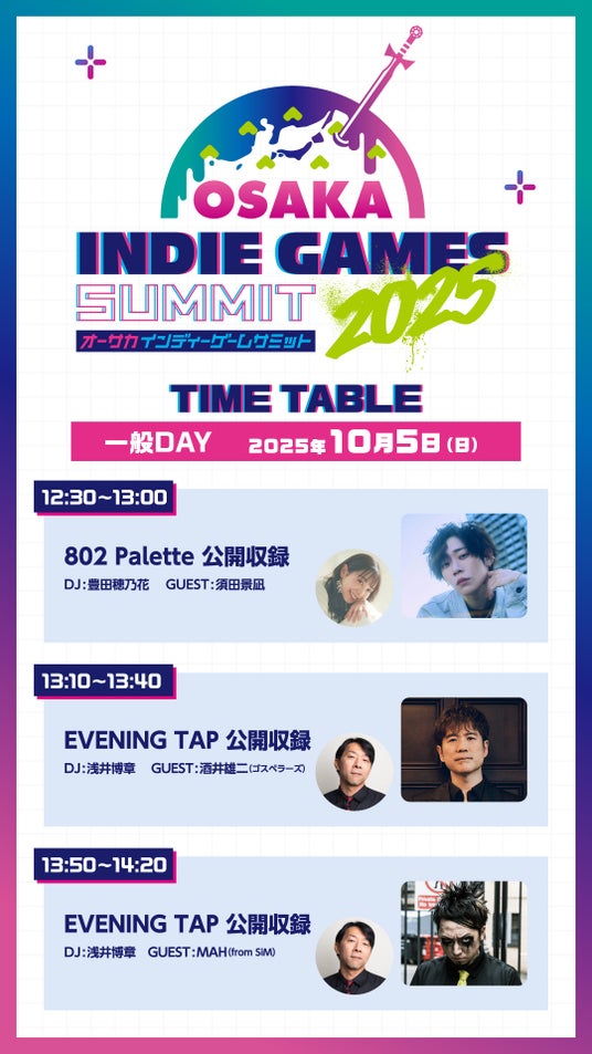 『OSAKA INDIE GAMES SUMMIT 2025』のステージでは、豪華ゲストを迎えたトークセッションやFM802の公開収録など、見逃せないプログラムが勢ぞろい。ゲームクリエイターもファンもゲームビジネスに関わる方にも、インディーゲームの熱気を体感できる多彩なコンテンツをお楽しみいただけます。