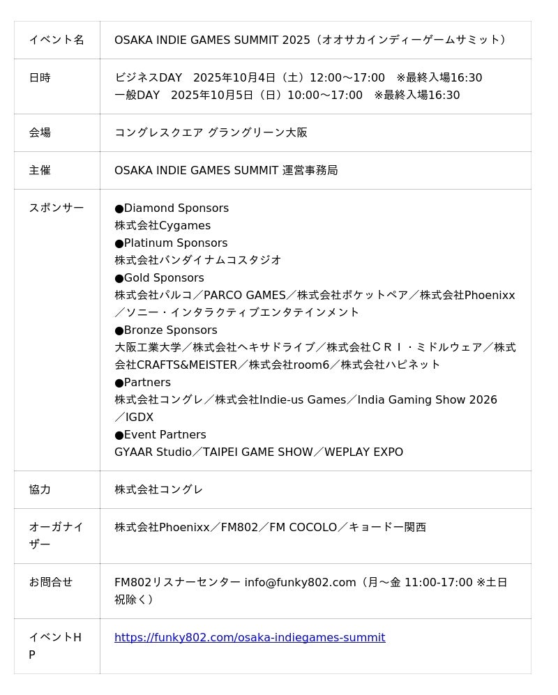 『OSAKA INDIE GAMES SUMMIT』は、“関西から世界へ”をテーマに、インディーゲームをはじめ様々なクリエイターの才能が集う新たなイベントです。2025年に初開催を迎え、クリエイターとユーザー双方に「このイベントならではの発見や体感の場」を提供いたします。開催は2日間にわたり、1日目をビジネスデイ、2日目を一般公開日として実施し、チケットは好評販売中です。