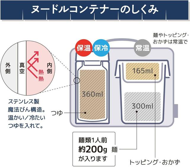 夏はやっぱりそうめんや冷やし中華などが食べたくなりますよね。そんな時にもこの「ヌードルコンテナー」が大活躍。魔法びん構造で高い保温・保冷力を発揮します。