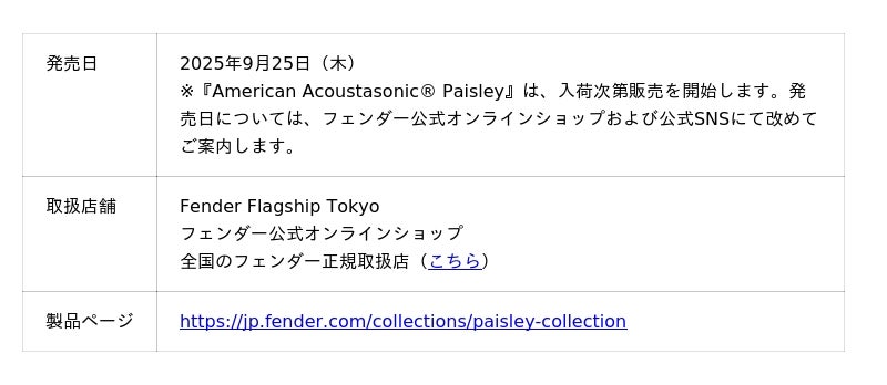 フェンダーを象徴するペイズリー柄を纏った『Limited Paisley Collection』が、2025年9月25日(木)より日本限定で発売されます。本コレクションでは、新モデルとなる『Made in Japan Limited Paisley』、『American Acoustasonic(R) Paisley』、さらにピック、グラス、バンダナといった国内限定のオリジナルライフスタイルアイテムまで、多彩なラインナップを取り揃えています。