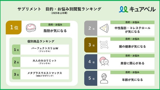 2025年度上半期のサプリメント検索における目的・お悩み別の商品一覧閲覧ランキングでは、1位が「脂肪が気になる」、2位が「中性脂肪 ・コレステロールが気になる」となり、3位には「腸の健康が気になる」が続きました。