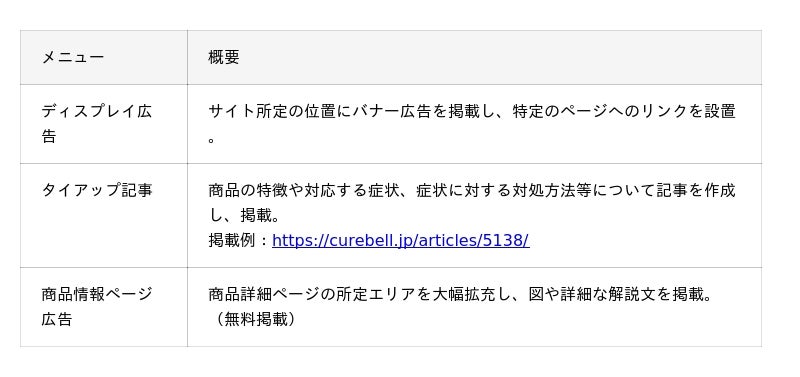 サプリメント、OTC医薬品等のメーカーは、自社商品の認知拡大、販売促進に直結するメディアとして、キュアベルの広告プロモーションサービスを活用できます。また、各ユーザーの症状やお悩み、既往歴等に合致した適切・適正な商品の訴求と販売に繋げます。<広告プロモーションサービスメニュー>