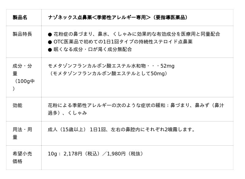 ナゾネックス点鼻薬<季節性アレルギー専用>(以下ナゾネックス)は、有効成分「モメタゾンフランカルボン酸エステル水和物」を医療用と同成分・同量を配合したスイッチOTC医薬品です。OTC医薬品としては初めて「1日1回タイプ」を実現した持続性ステロイド点鼻薬で、花粉症による鼻づまり・鼻水・くしゃみを、毎日1回の使用で24時間しっかり抑えることができます。眠くなる成分を含まないため、車の運転や仕事・勉強など日常生活における多様な場面でも使用が可能です。