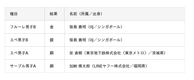 安 直樹選手(東京地下鉄株式会社)はエペ男子Aで銅メダル、加納 慎太郎選手(LINEヤフー株式会社)はサーブル男子Aで銅メダルを獲得しました。